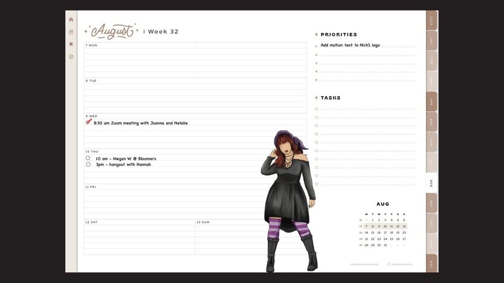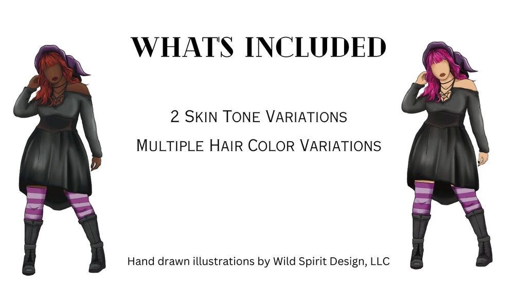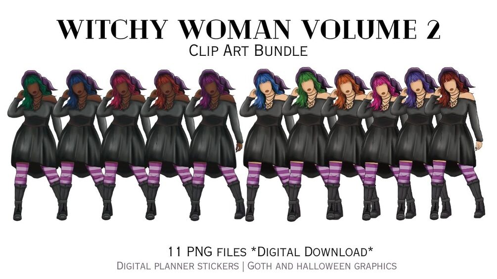 Take your digital planner, Halloween invites and crafts to a new level with a sassy witch adorned in a classic black dress, quirky striped stockings, and an iconic witch's hat. This bundle offers a delightful variety with two distinct skin tones and hair color variations, allowing you to personalize each piece according to your imagination.