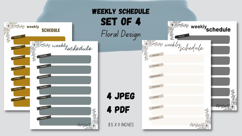 A mini bundle contains 4 designs for an aesthetically pleasing weekly schedule spreads featuring a simple floral design in the background. This mini bundle will be downloaded as a Zip file - once purchased, download on your chosen device and use in 2 ways: scale and print to use as a digital weekly planner or import the PDFs into a digital program such as Good Notes. Zip file contains 4 JPEGs and 4 PDFs