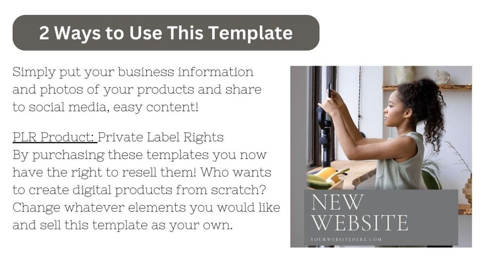 Elevate your business launch with 9 of our made-for-you Canva templates. This PLR (Private Label Rights) pack empowers you to create eye-catching promotional materials for your business or to resell to others. Add a touch of your personality to these templates and resell or use them as a base template and craft stunning social media posts, banners, flyers, and more, all tailored for successful business launches. Whether you're a seasoned entrepreneur or just starting out, our editable templates make it easy to impress your audience. PLR products are a great way to start selling online, especially if you don't have the confidence to design digital products yourself from scratch!!